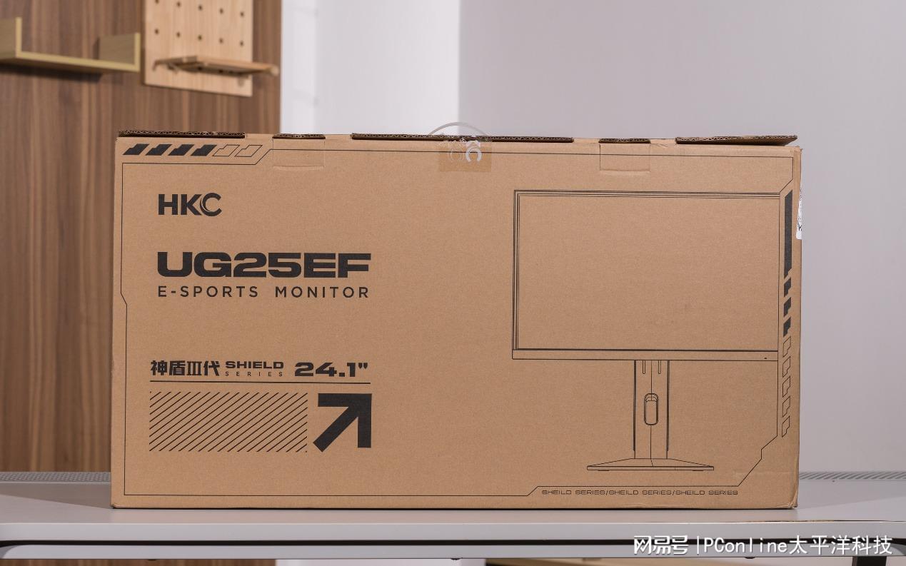 在进行详细的评测之前,让我们先对产品进行一个简单的开箱,这台HKC UG25EF的包装整体设计较为简约。使用了原色瓦楞纸作为外包装包材,包装上印有产品名称,外观简图和所属系列。