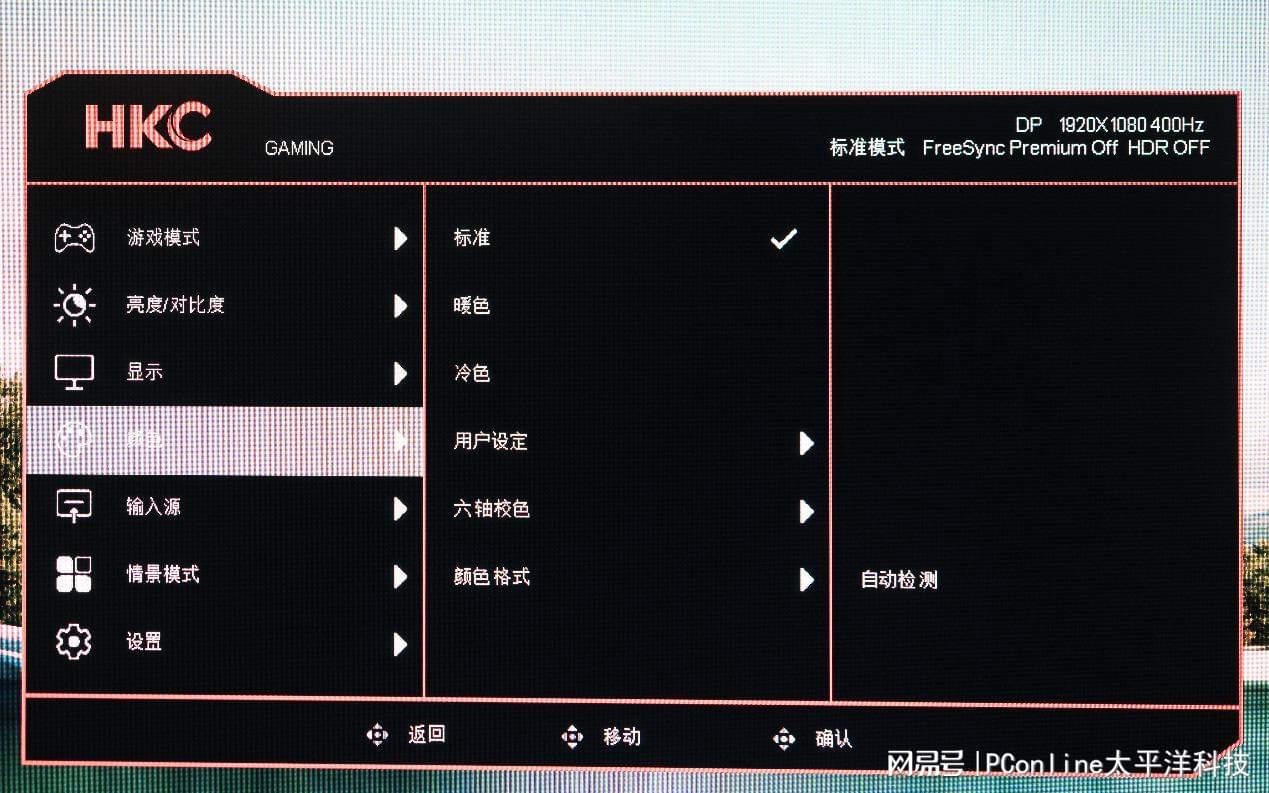 最后让我们来看看HKC UG25EF 的OSD菜单设计,HKC UG25EF的OSD 菜单沿袭了 HKC 传统的黑红风格。搭配显示器背面的五向摇杆式按键即可进行方便的盲操。