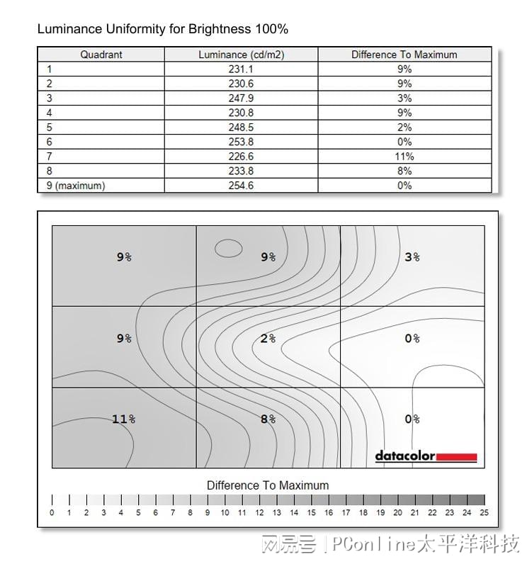 至于亮度均匀性方面,HKC UG25EF的表现还算不错,在100%的最大亮度下,HKC UG25EF的屏幕表现为左侧整体偏亮,其中最大的亮度偏差区域出现在屏幕左下角,差值为11%。