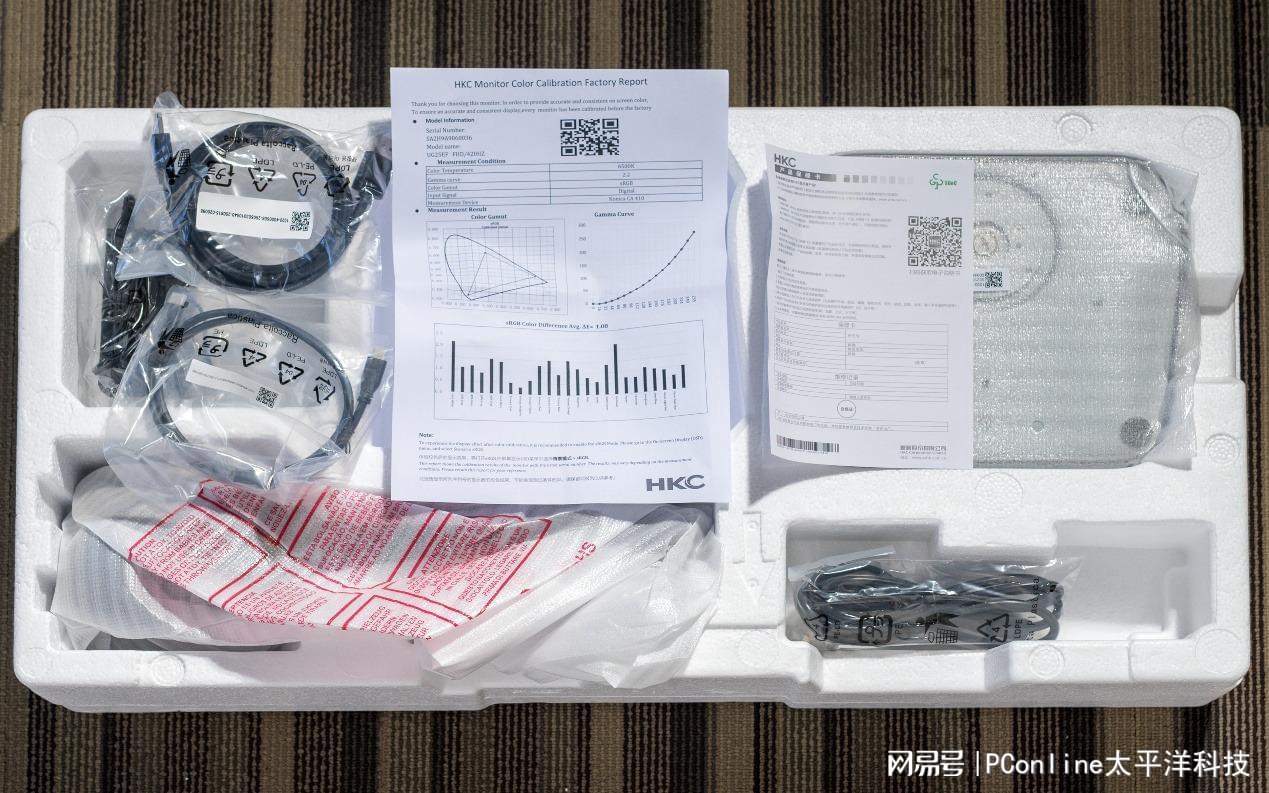 虽然包装整体较为朴素,但是HKC UG25EF的内部配件相当齐全,除了必要的显示器支架和电源适配器之外,HKC UG25EF还随机附赠了一条DP线和一条USB-C线,方便玩家开箱后可以快速使用