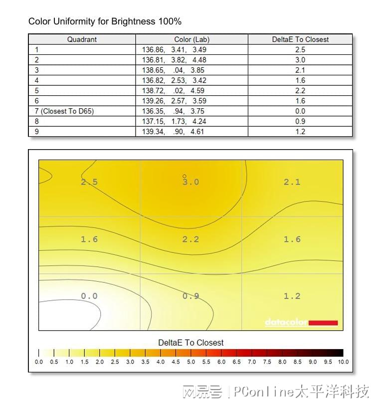在100%亮度下,HKC UG25EF的色彩均匀性相当出色,最接近D65标准的区域为7号区域,而其他区域与7号区域的最大差值ΔE只有3.0,为屏幕上方中央的的2号区域,这样的测试结果证明,在显示画面时,HKC UG25EF的色彩一致性极高。