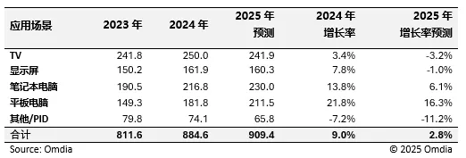 根据报告数据,2025年大尺寸LCD面板出货量预计将达8.739亿台,同比增长2.2%。尽管LCD电视和传统显示器出货量预计将分别下降3.4%和1.8%,但平板电脑和笔记本电脑的LCD面板需求显著上升,同比增幅预计分别为17.5%和4.2%,成为拉动整体增长的关键因素。
